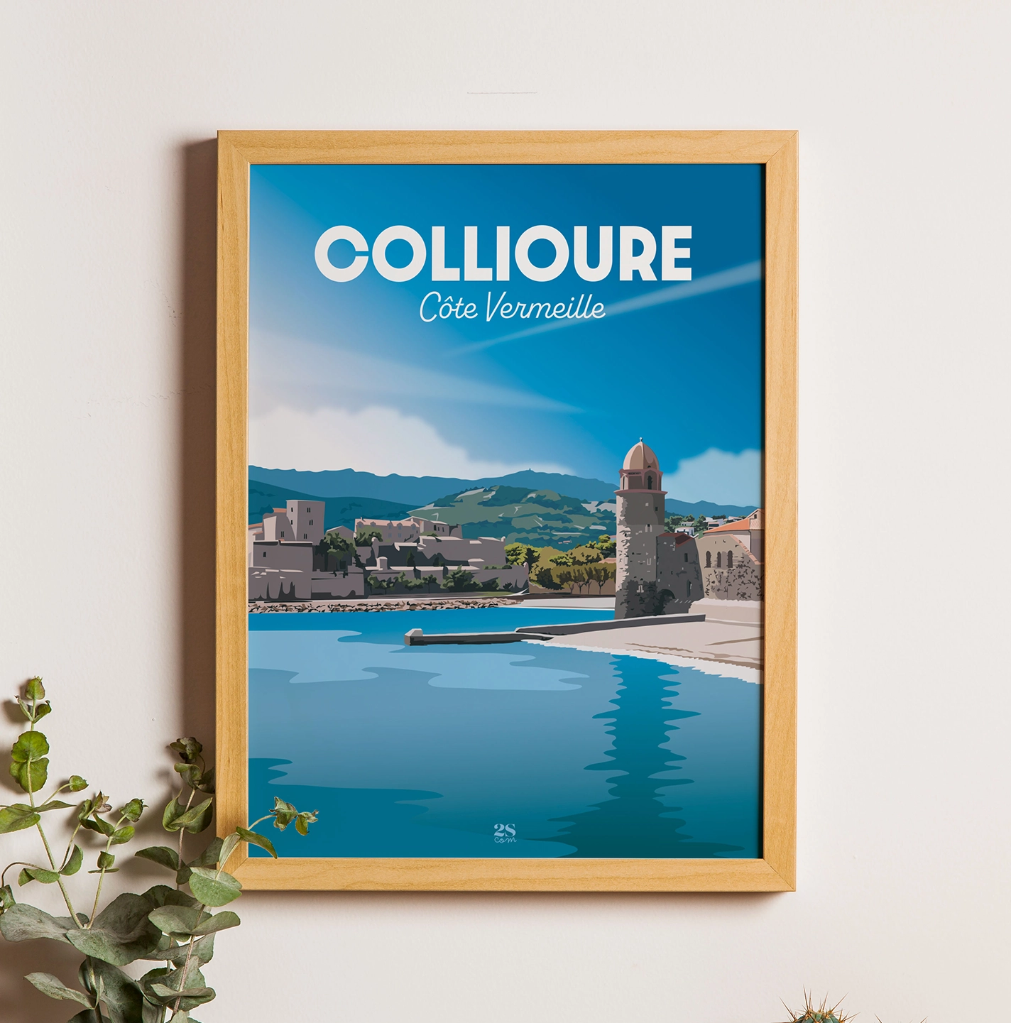 Affiche illustrant la charmante ville de Collioure. Parfaite pour votre décoration, cette illustration évoque l’atmosphère pittoresque et ensoleillée de ce joyau de la Côte Vermeille.